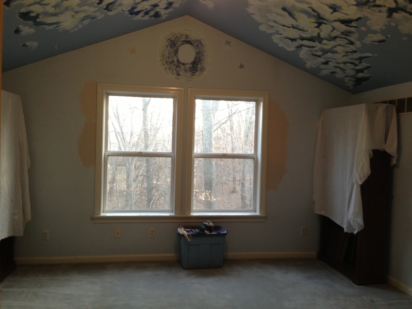 The clouds on the ceiling had been done in oil paint and were very texture-y, hard to remove!