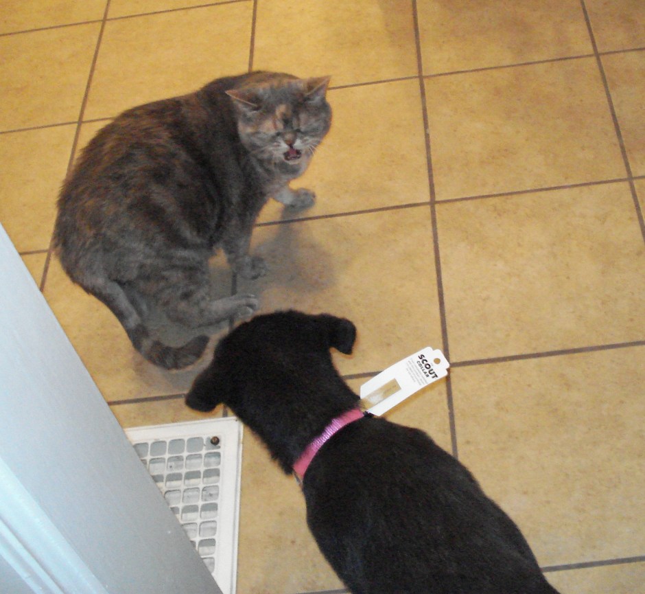 In the meantime, here is a photo of Trixie meeting Minerva, one of her feline housemates, for the first time.